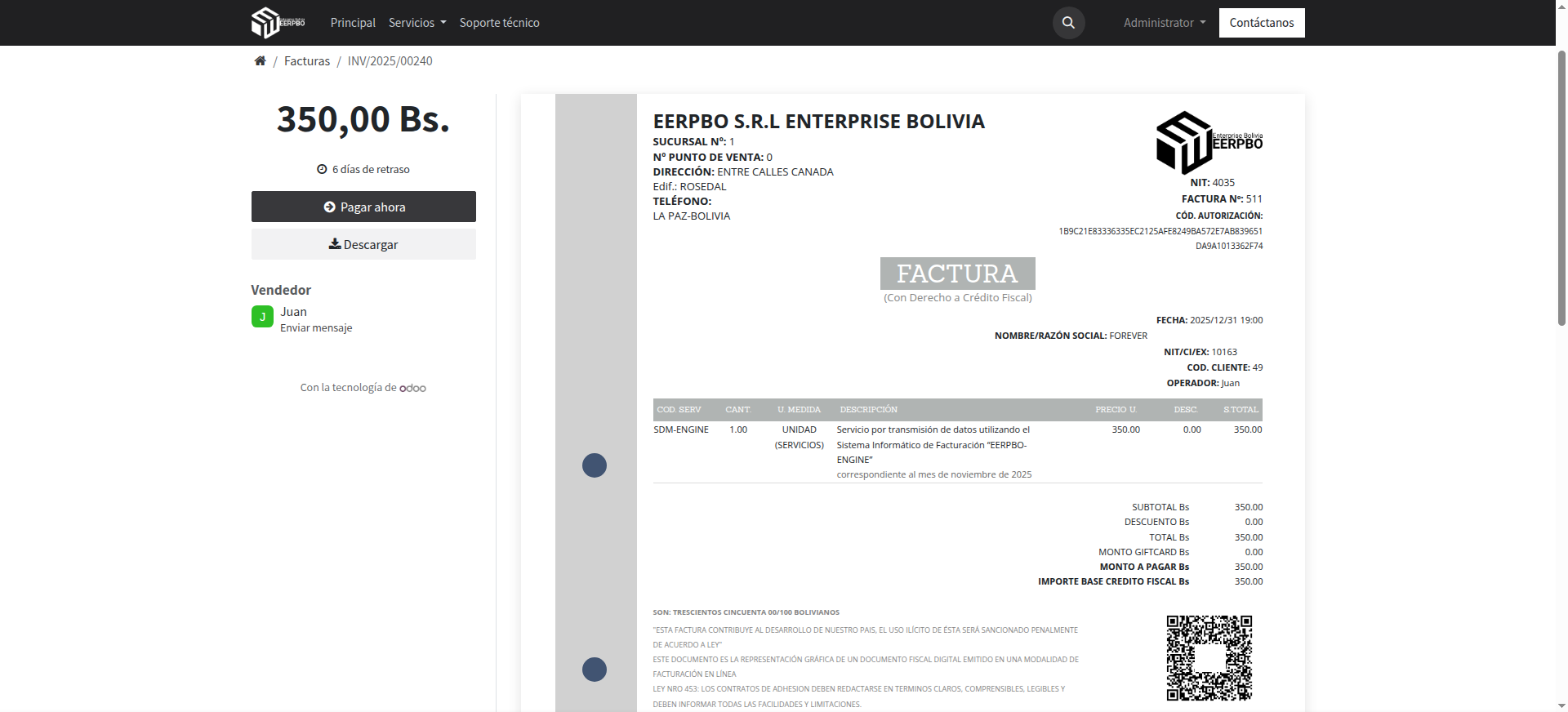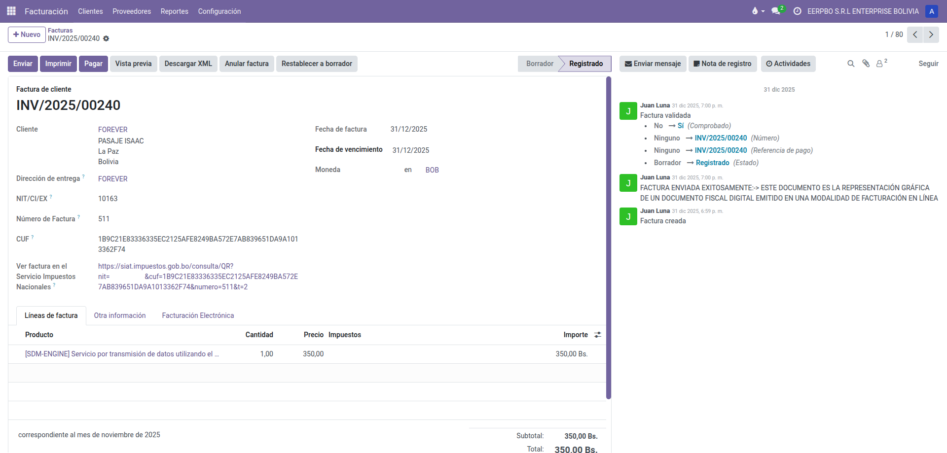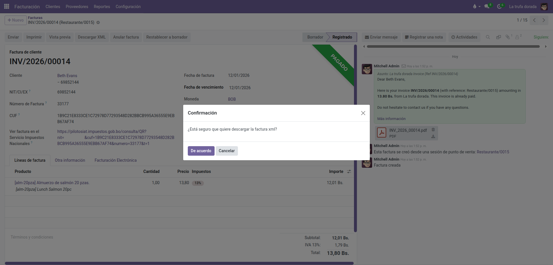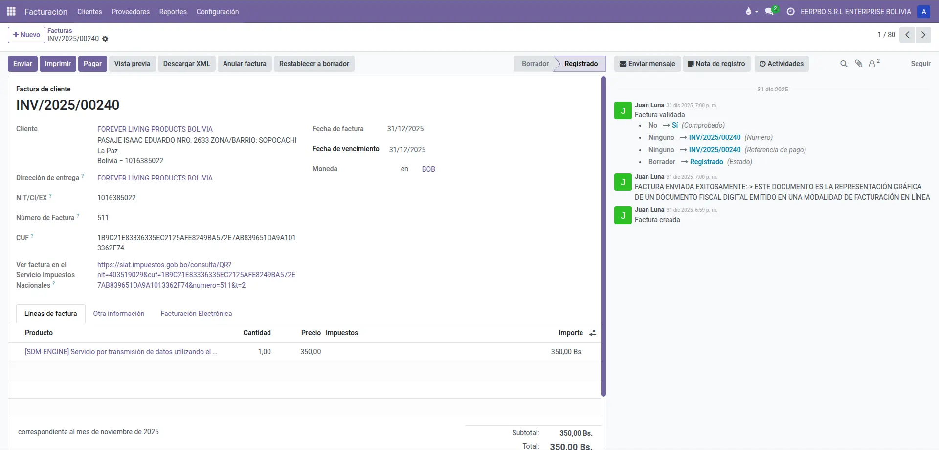 Ideal para departamentos contables y ventas B2B. Emita facturas comerciales, de exportación o de servicios básicos directamente desde el módulo de Ventas o Contabilidad de Odoo.